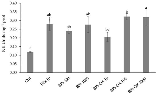 The nitrate reductase (NR) activities (Figure 3) in lettuces showed a significant increase under all the treatments tested, except for BPs OX 10, for which a value similar to the control was recorded. The highest values were registered with BPs OX 100 and BPs OX 1000, which increased the NR activity with respect to the control by around 171% and 168%, respectively.
