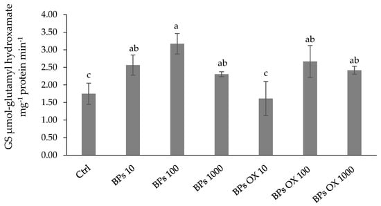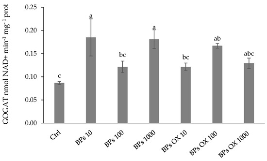 The glutamate synthase (GOGAT) activity (Figure 5) exhibited a similar performance to the previous enzymatic activities. The highest activities were recorded with the BPs 10 and BPs 1000 treatments, with an increase with respect to the control of 112% and 108%, respectively.