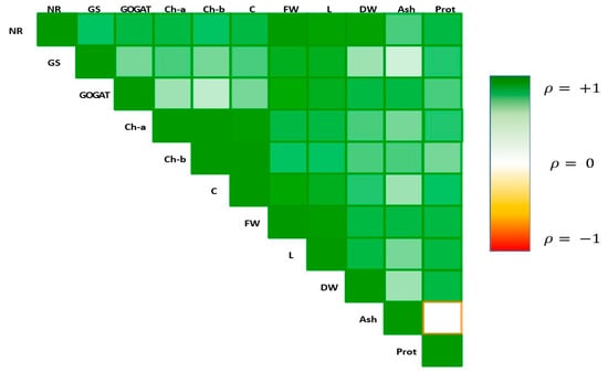 Pearson’s correlation coefficients of all the analyzed parameters in the experimental trials. Dataset: NR: nitrate reductase, GS: glutamine synthetase, GOGAT: glutamate synthase, Ch-a: chlorophyll-a, Ch-b: chlorophyll-b, C: carotenoids, FW: fresh weight, L: lettuce length, DW: dry weight, ash, Prot: total proteins. Each square is represented by a particular color shade according to its own Pearson’s correlation coefficient; a full green square represents a correlation value of +1 and a full red one a correlation value of −1.
