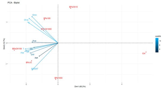 As regards treatments, Ctrl represents the farthest from all treatments and gives us insights about the separation between the control sample and all eigenvalues. For the BPs treatments, BPs 10 is the most in the direction of the eigenvalues, followed by BPs 100. For the BPs OX treatments, BPs OX 100 is the best pointed out. In particular, BPs OX 100 is the most highly correlated with FW and NR, which are two of the three parameters with the greatest contribution of PC1.