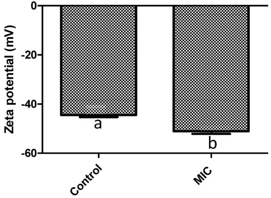 Zeta potential values (mV) of S. aureus after 1 h of exposure to F. retinophylla MIC ethanolic extract. Data are presented as mean ± standard deviation. a-b Mean with different letter are different (p < 0.05).