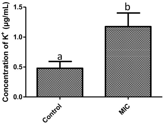 Concentration of K+ (µg/mL) in solution of S. aureus after 1 h of exposure to F. retinophylla MIC ethanolic extract. Data are presented as mean ± standard deviation. a-b Mean with different letter are different (p < 0.05).