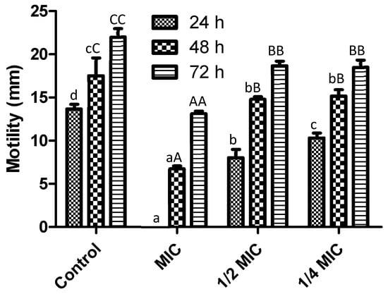 Motility (mm) of S. aureus after 72 h of exposure to different F. retinophylla ethanolic extract concentration. Data are presented as mean ± standard deviation. a–d: 24 h; aA–cC: 48 h; AA–CC: 72 h Mean with different letter between the different time of incubation (24, 48 and 72 h) are different (p < 0.05).