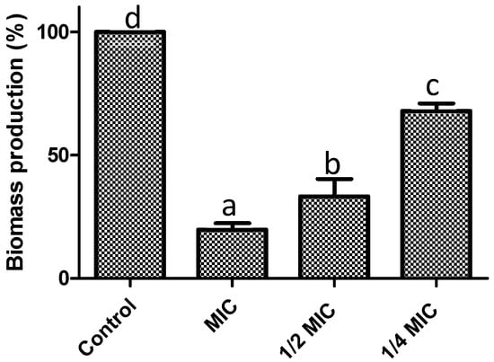 Biomass production: the content of each well was washed with 200 µL of saline solution (0.85% w/v) and fixed with 200 µL of methanol for 15 min. Subsequently, the microplates were air-dried and stained with 200 µL of crystal violet (CV, 1%, volume/volume, v/v). The CV was removed, and 200 µL of glacial acetic acid (33%, v/v) was added to the wells. Finally, a microplate reader (Multiskan Fc, Thermo Scientific) was used to measure the absorbance at 590 nm. Results were expressed as a percentage of biomass production [62].