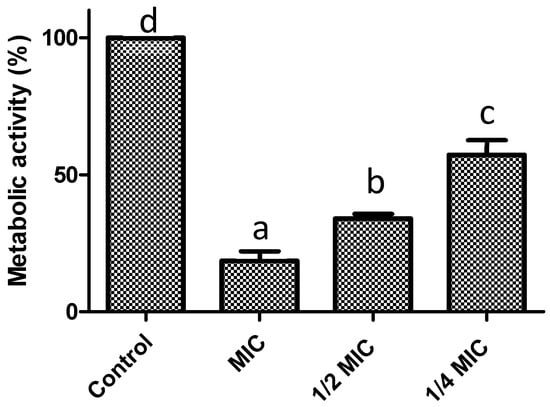 Another important factor in the pathogenesis of S. aureus is its ability to form biofilms. In this sense, we assessed the ability of F. retinophylla to inhibit the formation of S. aureus biofilms. The extract significantly inhibited biomass formation (p < 0.05) by 80% at MIC, by 67% at 1/2 MIC and by 32% at 1/4 MIC (Figure 4). The extract also reduced the metabolic activity of the bacterial cells of the biofilms (p < 0.05), being most effective at MIC with a reduction of 82% (Figure 5). Concentrations of 1/2 MIC and 1/4 MIC also reduced (p < 0.05) the metabolic activity of biofilms by 66% and 43%, respectively.
