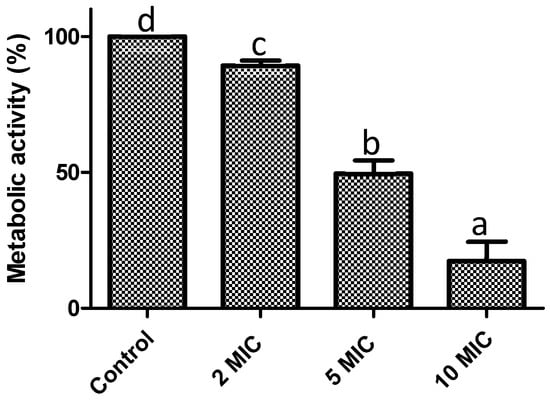 Metabolic activity: the content of each well was washed with saline solution (0.85% w/v). XTT was dissolved in saline solution (0.85%, w/v) to obtain a 1 mg/mL concentration. Subsequently, the solution was filter-sterilized and stored at −80 °C. Menadione was dissolved in acetone to obtain a 1 mM concentration and sterilized. Each well was then filled with 200 µL of saline solution (0.85%, w/v), and 27 µL of an XTT (sodium 3′-[1-(phenylaminocarbonyl)-3,4-tetrazolium]-bis(4-methoxy6-nitro) benzene sulfonic acid hydrate)/menadione mixture (relation 12.5:1) was added. The microplates were incubated in darkness at 37 °C for 2–3 h. Absorbance was measured at 490 nm in a microplate reader (Multiskan Fc, Thermo Scientific). Results were represented as a percentage of metabolic activity [67].