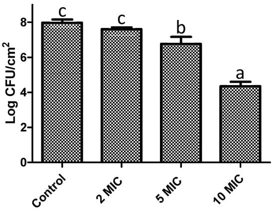 Biofilm viable cells: the content of each well was washed with saline solution (0.85% w/v). Each well was then filled with 200 µL of saline solution (0.85%, w/v) and scrapped from the microtiter plate using a pipette tip for 1 min. This process was replicated three times. After, serial dilutions (1:10) were performed in saline solution (0.85%, w/v). Subsequently, 10 µL of each dilution was cultured on plate count agar. The inoculated plates were incubated for 24 h at 37 °C. Finally, the bacterial colonies were quantified. Results were represented as log CFU/cm2 [62].