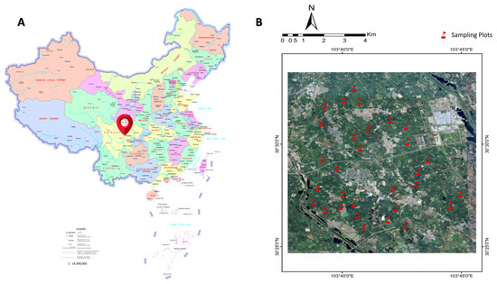 Location of study areas (A). The red note indicates the location of each sampling plot (B) in the study areas. The map of China is a 1400 standard map drawn by the Ministry of Natural Resources of the PRC, and the approval number is GS [2022] No. 4308.