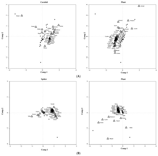 Biplot based on predictive co-correspondence analysis of carabids (A) and spiders (B) against plants. The species (triangles) are positioned in the graph according to their loadings with respect to normalized site scores (triangles) derived from plants, and black dots represent sampling plots.
