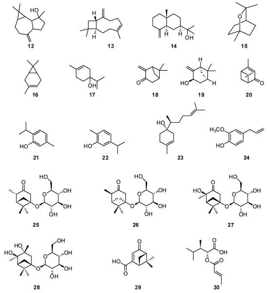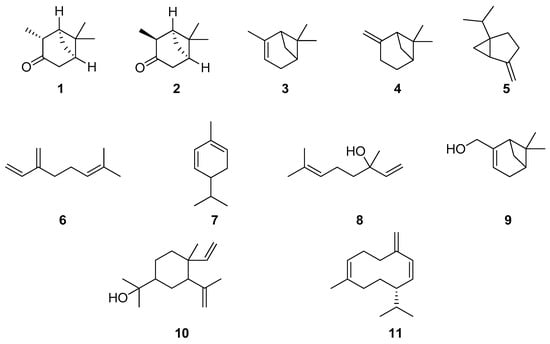 Many publications are devoted to the study of the species H. officinalis L. growing in European, Asian and African countries. The component composition and quantitative content of various constituents in essential oils may vary depending on soil, climatic and genetic factors [12,30,31,32,33,34,35,36,37,38,39,40,41,42,43,44,45,46,47,48,49,50,51,52,53,54,55,56,57,58,59,60,61,62]; however, the main ketones that are characteristic of this species are pinocamphone 1 and cis-pinocamphone 2 (their relative content varies ranging from 2.94 to 63.55%; these components are in dynamic equilibrium), α-pinene 3 and β-pinene 4, sabinene 5, myrcene 6, phellandrene 7, linalool 8, myrtenol 9, elemol 10 and germacrene-D 11 (Figure 1).