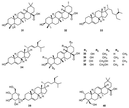 Many species of the family Lamiaceae accumulate significant amounts of triterpenoids, which are structurally and genetically similar to steroids. Of particular interest are the pentacyclic triterpene acids—ursolic 31 and oleanolic 32—which were found in the raw materials of some Hyssopus species (Figure 3) [73].