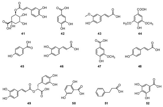 To date, about thirty phenolic acids and their derivatives have been isolated from the genus Hyssopus, including chlorogenic acid 41, protocatechuic acid 41, ferulic acid 43, lilac acid 44, hydroxybenzoic acid 45, caffeic acid 46, vanillic acid 47, p-coumaric acid 48, rosemary acid 49, gentisic acid 50 and phenylpropane 51 (Figure 4). These remain characteristic of the genus and are usually present in most Hyssopus species [78,79,80,81,82].