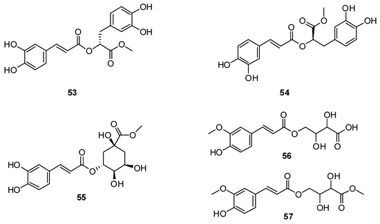 From 17 kg of H. cuspidatus, 17 compounds were obtained, from which rosmarinic acid 49 and methyl rosmarinate 53, 4-O-caffeoylquinic acid methyl ester 54, 3-O-caffeoylquinic acid methyl ester 55 and caffeic acid 46 were isolated for the first time [77]. In addition, two new phenolic acids (Figure 5), (E)-2,3-dihydroxy-4-((3-(4-hydroxy-3-methoxyphenyl)acryloyl)oxy)butanoic acid 56 and (E)-methyl 2,3-dihydroxy-4-((3-(4-hydroxy-3-methoxyphenyl)acryloyl)oxy)butanoate 57, were identified for the first time from H. cuspidatus, along with eleven known polyphenolic compounds [86].