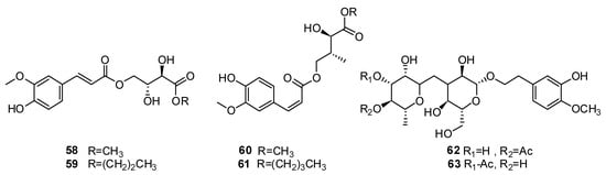 H. cuspidatus is a famous spice in Central Asia. In addition to the essential oil, non-volatile new compounds have been isolated from this plant species. The authors of [87] identified 64 compounds using LC-MS/MS, with phenolic compounds being the dominant components. The systematic separation and purification of H. cuspidatus ethanol extract resulted in the isolation of 34 compounds. The following 6 compounds (Figure 6) were identified as new compounds: hyssopusine A 58, hyssopusine B 59, hyssopusine C 60, hyssopusine D 61, 4′ ′-acetyldarendoside A 62 and 3′ ′-acetyldarendoside A—63, and 18 compounds were isolated from H. cuspidatus extract for the first time.