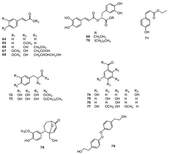Among them were the following: €-cinnamic acid 64, 4-methoxycinnamic acid 65, ethyl p-coumarate 66, ferulic acid 43, carboxymethyl isoferulate 67, 1-O-feruloylglycerol 68, rosmarinic acid 49, methyl rosmarinate 53, ethyl rosmarinate 69, butyl rosmarinate 70, cis-p-coumaric acid ethyl ester 71, 5R-5-hydroxy methyl-2 (5H)-furanone 72, n-butyl-3,4-dihydroxy-phenyllactate 73, p-hydroxybenzoic acid 45, salicylic acid 74, protocatechuic aldehyde 75, p-hydroxybenzaldehyde 76, syringic acid 77, (+)-ligusticumtone 78 and p-hydroxy phenethyl alcohol 79 (Figure 7).