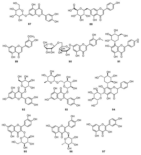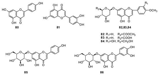 Apigenin 80, luteolin 81, acacetin-7-O-β−methyl glucuronide 82, acacetin-7-O-β−glucuronide 83, diosmetin 7-O-β−D-glucoside 84, apigenin 7-O-β−glucoside 85, luteolin-7-O-β-D-glucoside 86 and luteolin-7-O-β−D-galactoside 87 were first isolated from the genus H. officinalis (Figure 8) [88].