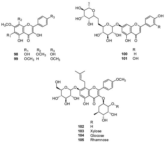 In China, scientists isolated for the first time eight flavonoids (Figure 10) from the H. cuspidatus herb: 5,6,4′-trihydroxyl-7,8-dimethoxyflavone 98, salvigenin 99, apigenin-7-rutinoside 100, luteolin-7-O-α-L-rhamnosyl (1 → 6)-β-D-glucoside 101, icariin 102, 4-methoxy-5-hydroxy-8–3,3-dimethylallyl flavone-3-O-β-D-xylopyranosyl (1 → 2)-α-L-rhamnopyranoside-7-O-β-D-glucopyranoside 103, 4′-methoxy-5-hydroxy-8–3,3-dimethylallyl flavone-3-O-β-D-glucopyranosyl (1 → 2)-α-L-rhamnopyranoside-7-O-β-D-glucopyranoside 104 and 4′-methoxy-5-hydroxy-8–3,3-dimethylallylflavone-3-O-β-L-rhamnopyranosyl (1 → 2)-α-L-rhamnopyranoside-7-O-β-D-glucopyranoside 105 [87].