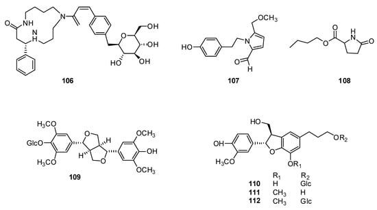 In addition, the lignan-type compounds syringaresinol 4′-O-β-D-glucopyranoside 109, dihydrodehydrodiconiferyl alcohol 9′-O-β-D-glucopyranoside 110, dihydrodehydrodiconiferyl alcohol 111 and (7R, 8S)-4,3′,9-trihydroxyl-3-methoxyl-7,8-dihydro-benzofuran-1′-propyl-neolignan 9′-O-β-D-glucopyranoside 112 were isolated from this compound [91].