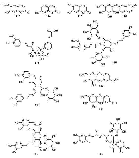 The coumarins esculetin 114 and umbelliferon hexoside 116 were isolated and identified in H. cuspidatus [91].