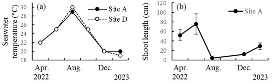 At two sites along the Tanegashima coast (sites A and D in Figure S1), seawater temperature increased from 22 °C in April 2022 to 29–30 °C in August (i.e., summer) and decreased to 19–20 °C in February 2023 (i.e., winter) (Figure 1). The mean shoot length of S. nipponicum at site A (Figure S1) gradually increased from 52.2 cm in April 2022 to 75.7 cm in June and rapidly decreased to 4.1 cm in August (i.e., summer). Then, it gradually increased to 12.3 cm in December (i.e., autumn) and rapidly reached 29.0 cm in February 2023 (i.e., winter) (Figure 1).