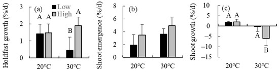 (a) Holdfast grow rates, (b) shoot emergence rate, and (c) shoot growth rate of the brown alga Sargassum nipponicum cultured in two temperature levels (20 and 30 °C) combined with two irradiance levels (low: 30 µmol photons m−2 s−1 and high: 130 µmol photons m−2 s−1). Values are expressed as means ± standard deviations. Different uppercase letters indicate statistical significance (p < 0.05) among the different treatments.
