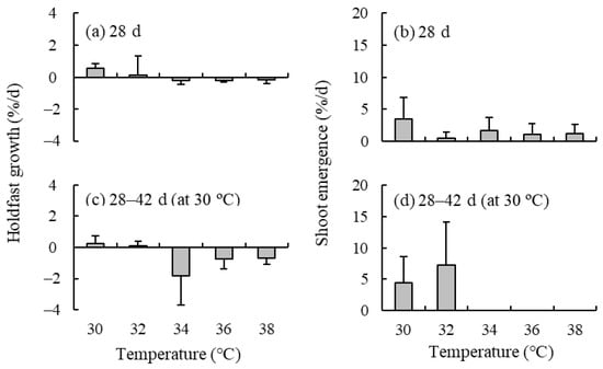 The mean holdfast growth rates during 28 d of culture in natural seawater were positive at 30 °C and 32 °C but negative at 34, 36, and 38 °C (Figure 3). The emergence of shoots from holdfasts was observed at all tested temperatures during this period. After 14 d of culture at 30 °C, the holdfast growth rates and shoot emergence rate in all treatments were positive at 30 and 32 °C but negative at 34, 36, and 38 °C. In contrast, the shoot growth rates were negative (values ranging from −8.87 to −0.84% d−1) at all the above-mentioned temperatures (30–38 °C) after only 7 d of culture (Figure S1). The appearance of the holdfast did not change even at high temperatures, whereas the shoots were apparently decomposed.