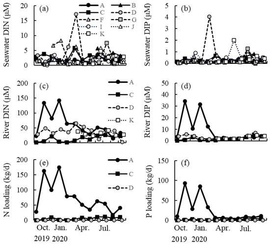 Seasonal changes in (a) dissolved inorganic nitrogen (DIN) and (b) dissolved inorganic phosphorus (DIP) concentrations of seawater collected at 9 sites (A, B, C, D, F, G, I, J, and K in Figure S1) in Tanegashima Island. Seasonal changes in (c) DIN and (d) DIP concentrations of river water collected at 4 sites (A, C, D, and K). Seasonal changes in (e) nitrogen and (f) phosphorus loading transported by the river toward the coast at 3 sites (A, C, and D).