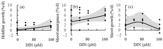 (a) Holdfast grow rate, (b) shoot emergence rate, and (c) shoot growth rate of the brown alga Sargassum nipponicum cultured in four nutrient levels (DIN/DIP = 0/0, 40/4, 80/8, and 160/16 μM). Solid lines and gray zones indicate mean and confidence intervals, respectively, estimated using linear (a,b) and generalized additive (c) models.