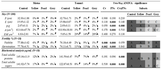 Morphological and ultrastructural parameters, pollen viability and germination, total soluble proteins (TSPs) and total soluble sugars (TSSs) from Matua and Tomuri cultivars grown in open field conditions (the control) and under PNs (yellow, pearl, and grey). Different subset columns colour and letters indicate statistically significantly different means according to the two-way ANOVA test followed by the Duncan post hoc test (p < 0.05) for pairwise comparisons of the P, E, P/E ratio, area (A), and exine microperforations (EM). Bold numbers report statistically significant differences. Cv: cultivar; PNs: photoselective nets.