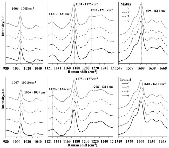 Detailed Raman spectra of Matua (upper) and Tomuri pollen collected in open field conditions (C: control) and PNs (Y: yellow; P: pearl; and G: grey). Prominent band modifications are highlighted (the pointed line).