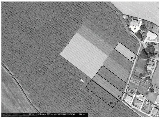 Google, Digital Globe images from the study orchard of A. deliciosa Hayward cultivars in São Salvador de Briteiros, Guimarães. Identification of the photoselective nets (PNs): yellow (Y), pearl (P), grey (G), and uncovered control (UC).