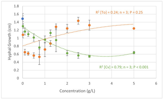 Figure 1. Quadratic regression analysis of the relationship between the hyphal growth (cm) of Fusarium oxysporum and the concentrations of C. vulgaris (green) and T. obliquus (orange). R2—coefficient of determination; P—probability; and n—number of observations. In blue is represented the hyphal growth in the negative control.