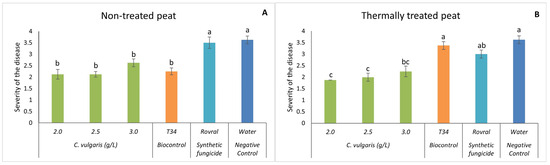Figure 2. In vivo severity of F. oxysporum-induced disease in spinach plants. (A) Disease severity results in non-treated peat with C. vulgaris. (B) Disease severity results in thermally treated peat with C. vulgaris. The in vivo results of disease severity were recorded at the end of the trial. For each treatment, values are mean ± SE (n = 8). Bars with different letters indicate significantly different values at p < 0.05 by the Tukey–Kramer test.