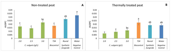 Figure 3. AUDPC results of F. oxysporum-induced disease in spinach treated with C. vulgaris. (A) AUDPC results in non-treated peat treated with C. vulgaris. (B) AUDPC results in thermally treated peat treated with C. vulgaris. AUDPC was calculated for each treatment; values are mean ± SE (n = 8). Bars with different letters correspond to significantly different values at p < 0.05 using the Tukey–Kramer test.
