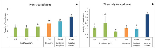 Figure 4. In vivo severity of F. oxysporum-induced disease in spinach plants. (A) Severity results in non-treated peat with T. obliquus. (B) Severity results in thermally treated peat with T. obliquus. In vivo results of severity were recorded at the end of the trial. For each treatment, values are mean ± SE (n = 8). Bars with different letters correspond to significantly different values at p < 0.05 using the Tukey–Kramer test.
