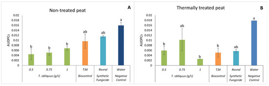 Figure 5. AUDPC results of F. oxysporum-induced disease in spinach treated with T. obliquus. (A) AUDPC results in non-treated peat treated with T. obliquus. (B) AUDPC results in thermally treated peat treated with T. obliquus. AUDPC was calculated for each treatment, values are mean ± SE (n = 8). Bars with different letters correspond to significantly different values at p < 0.05 using the Tukey–Kramer test.