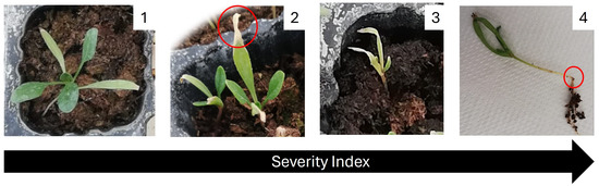 Weekly, the visual effects of the disease severity were evaluated according to a scale from 1 to 4, adapted from Baayen and Van der Plas [62], where 1 = no injuries to the plant, 2 = minor injuries, 3 = major injuries, and 4 = post-emerging damping off (Figure 6).
