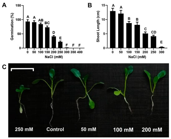 Figure 1. Selection of salinity level for Chinese flowering cabbage. (A) Response of seed germination at different salinity levels. (B) Shoot length of Chinese flowering cabbage at different salinity levels. (C) Seedling growth at different salinity levels. Capital letters on the bars show the level of significance according to ANOVA and DNMRT at p ≤ 0.05.