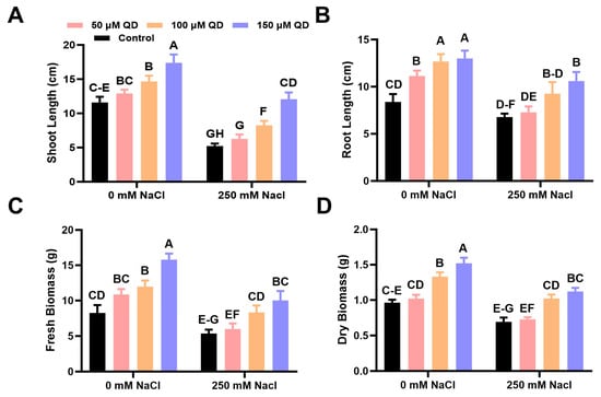Figure 2. Influence of quercetin dihydrate on vegetative growth parameters of Chinese flowering cabbage under salinity stress. (A) Change in shoot length; (B) Change in root length; (C) Change in fresh biomass; (D) Change in dry biomass; QD = Quercetin dihydrate. Dissimilar letters denote significant differences among the treatments (p ≤ 0.05). Capital letters on the bars show level of significance according to ANOVA and DNMRT at p ≤ 0.05.