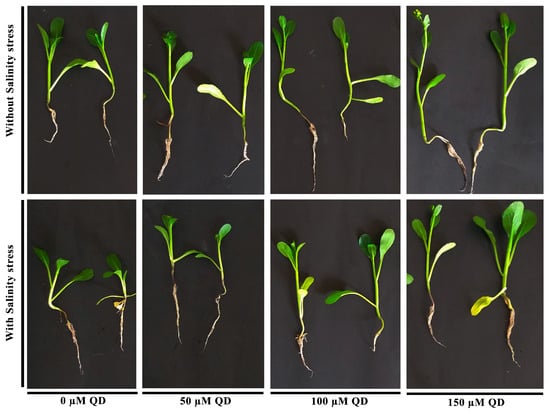 Figure 3. Response of Chinese flowering cabbage to foliar application of quercetin dihydrate under normal and salinity stress conditions. QD = Quercetin dihydrate. Plants were treated with quercetin dihydrate as foliar spray and salinity stress was applied as 250 mM NaCl solution as irrigation water.