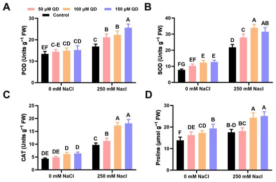 Figure 4. Effect of quercetin dihydrate and salinity stress antioxidative enzyme machinery of Chinese flowering cabbage plants. (A) Change in peroxidase (POD) activity; (B) Change in superoxide dismutase (SOD) activity; (C) Change in catalase (CAT) activity; (D) Change in proline contents. Data displayed as means ± standard error as shown by vertical bars. Dissimilar letters denote significant differences among the treatments (p ≤ 0.05).