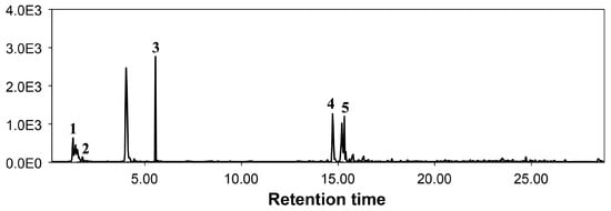 Figure 5. Representative chromatogram of glucosinolates detected in Chinese flowering cabbage. 1 = Progoitrin, 2 = Glucoalyssin, 3 = Gluconapin, 4 = Neoglucobrasscin, and 5 = Glucobrassicanapin.