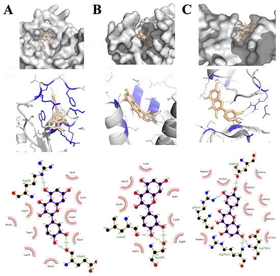 Figure 6. Molecular docking and interaction analysis of quercetin legend with different stress-responsive proteins of Chinese flowering cabbage. (A) DREB; (B) SOS3 and (C) STXBP1.