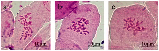 The root tips were washed three times with distilled water for 5 min each time. The washed root tips were transferred into 12 mol L−1 of HCl solution in a 60 °C water bath for 6 min. Then, the samples were washed in distilled water three times again. The treated root tips were transferred to a clean glass slide, cut into small pieces, and crushed by sterilized tweezers. After removing large pieces of residue, one drop of carbol fuchsin staining solution was added and the root tips were stained for 10 min. The sample was covered by a clean glass cover. Then, 45% acetic acid solution was dripped from one side of the cover glass and the excess solution was removed with absorbent paper at the other side. Finally, the sample was placed under a fluorescence inverted microscope (Zeiss Axio Vert. A1, Oberkochen, Germany). Lastly, photos of the chromosomes were taken and the number of chromosomes was counted when somatic cells with a clear division phase were observed.