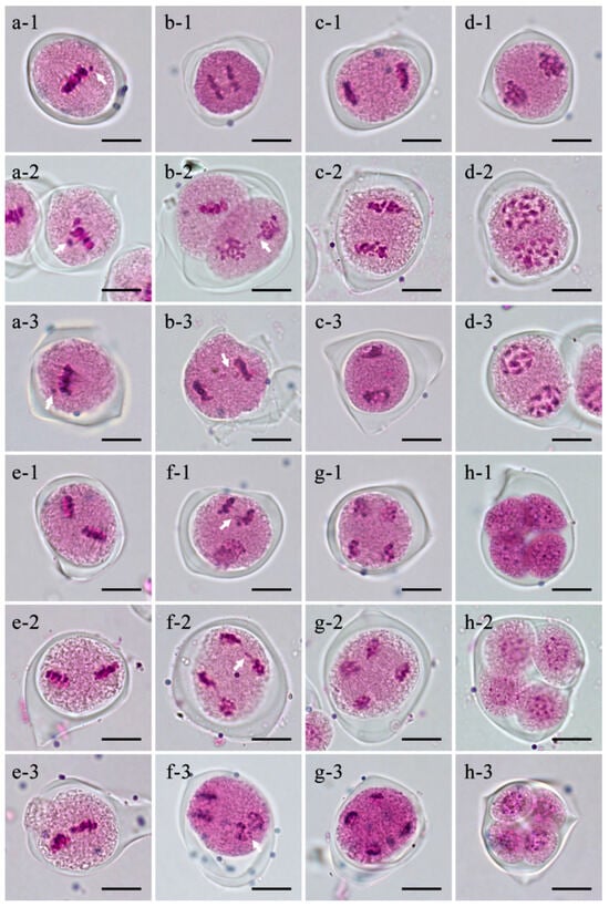 Meiosis observation of R2000, CLR650, and Zhehuhong: (a-1–a-3) meiotic metaphase I, (b-1–b-3) meiotic anaphase I, (c-1–c-3) meiotic telophase I, (d-1–d-3) meiotic prophase II, (e-1–e-3) meiotic metaphase II, (f-1–f-3) meiotic anaphase II, (g-1–g-3) meiotic telophase II, and (h-1–h-3) tetrad stage of R2000, CLR650, and Zhehuhong, respectively. The white arrows indicate chromosomal bridges. Bar = 10 μm.