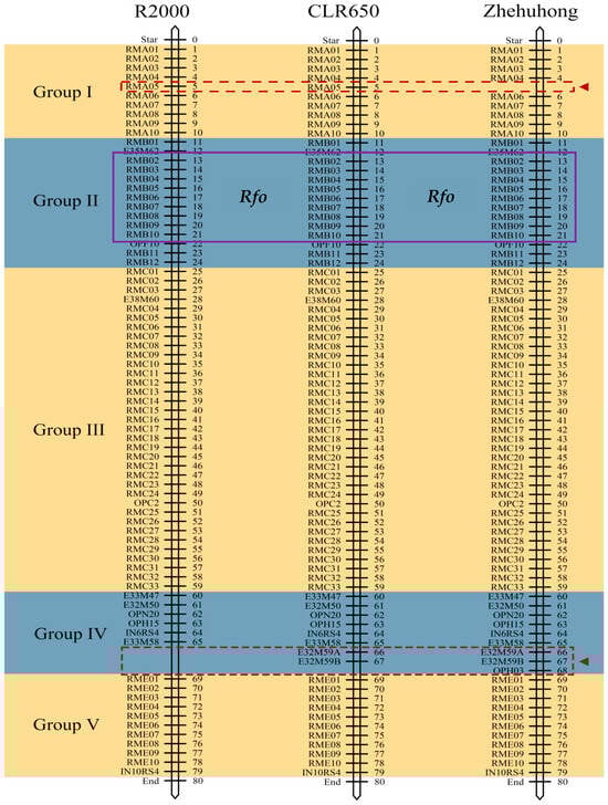 The following supporting information can be downloaded at https://www.mdpi.com/article/10.3390/plants13121703/s1. Table S1: The sequences of primers of the 79 molecular markers. Table S2: Primer sequences for Rfo (PPRB) genes. Table S3: Primer sequences for qRT-PCR. Figure S1 The Amplification results of 79 markers (listed in Supplementary Table S1) on R2000, CLR650 and Zhehuhong. 1–3 corresponds to the amplification of molecular markers RMA01 on Zhehuhong, CLR650 and R2000. 4–6 corresponds to the amplification of molecular markers RMA02 on Zhehuhong, CLR650 and R2000. 7–9 corresponds to the amplification of molecular markers RMA03 on Zhehuhong, CLR650 and R2000, and so on.