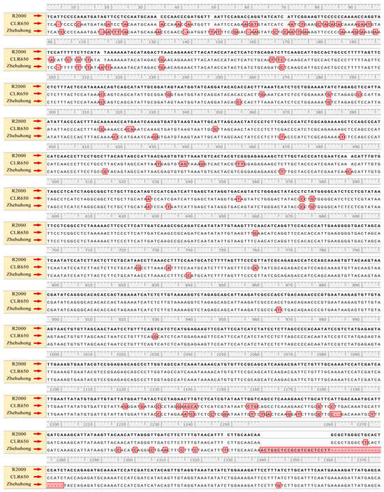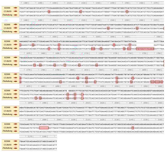 Sequencing results of amplification product of restorer gene PPRB in R2000, CLR650, and Zhehuhong. Red boxes represent single nucleotide polymorphism (SNP) and indels.
