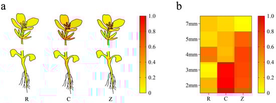 The molecular marker detection results showed that the length of the radish fragments introduced in Zhehuhong might be similar to that of CLR650, but longer than that of R2000. It is difficult to conclude whether the exogenous radish fragment in Zhehuhong was longer than that in CLR650, although both lost one marker. Their different locations for the lost marker suggested that the donor of exogenous radish fragments was different. Another possible reason for the inability to compare their fragment size was the differing introgression methods for Zhehuhong and CLR650. The introgression of radish fragments to the rapeseed chromosome in Zhehuhong was performed using the distant hybridization method, while grafting was used in CLR650 [,]. During distant hybridization, the random exchange of chromosomal fragments takes place between radish and rapeseed, and a stable condition will ultimately be formed after several generations of self-pollination. For the grafting method, the first generation of plants maintains its own sets of chromosomes. However, during self-pollination in the next generation, the exchange of chromosomes between two species will occur and most of the exogenous chromosome fragments will be lost. The process of chromosomal exchange had some common behaviors, such as the randomness and substantial separation of many agronomic traits after the first generation [,,]. In the current study, we did not map the genetic distance of exogenous radish fragments in Zhehuhong. However, a considerable investigation of the radish fragments in R2000 and the new developed lines from CLR65, such as CLR6430, had been conducted. It was reported that the radish fragment in CLR6430 was 72.4 cM [,,]. However, the exact length of exogenous radish chromosome fragments is unclear in all three lines. Other researchers reported that the restorer gene from different sources, including R. raphanistrum from Turkey, the Japanese wild radish, European cultivars, and lines from China, resulted in the same or similar loci [,]. However, the length of the exogenous radish chromosome was expected to be shorter than that of R2000, because R2000 was bred using irradiation to reduce the length of exogenous radish chromosome fragments []. As is known, subjecting organisms to X-ray irradiation can lead to chromosome fragment breakage []. As proven, the exogenous radish chromosome fragment can be efficiently shortened, although other methods have also been established to achieve this. The different lengths of exogenous radish fragments between Zhehuhong and R2000 indicated that they are different Ogura CMS restorer lines.