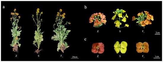 Plant morphology and flower organ morphology of Zhehuhong, Ogura CMS sterile line HA3, and their hybrid F1. (a–c), Plant morphology, inflorescence, and petal morphology of Zhehuhong, HA3, and their hybrid F1, respectively. Z: Zhehuhong, S: Ogura CMS sterile line HA3, F1: the hybrid offspring of Zhehuhong (Z, male parent) and HA3 plant (S, female parent).