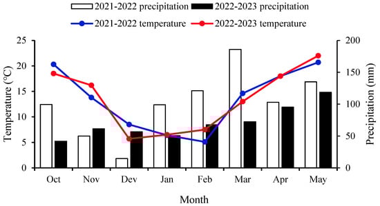 Temperature and precipitation during rapeseed growth in 2021–2022 and 2022–2023.